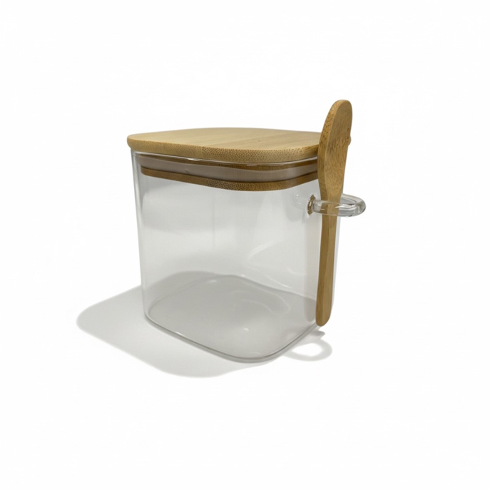 Frasco de vidrio cuadrado con tapa y cuchara de bamboo