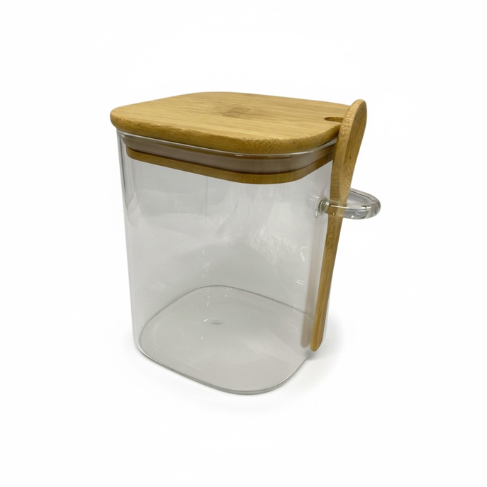 Frasco de vidrio cuadrado tapa y cuchara bamboo